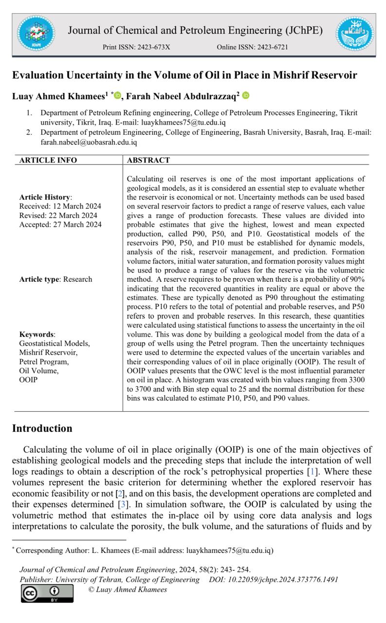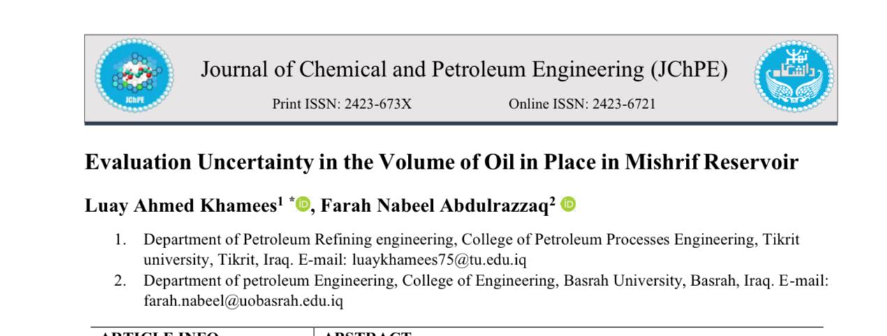 قام التدريسي في كلية هندسة العمليات النفطية في جامعة تكريت (م. لؤي احمد خميس) و بالتعاون مع باحثة من جامعة البصرة- كلية الهندسة-قسم هندسة النفط، بنشر بحث علمي بعنوان: