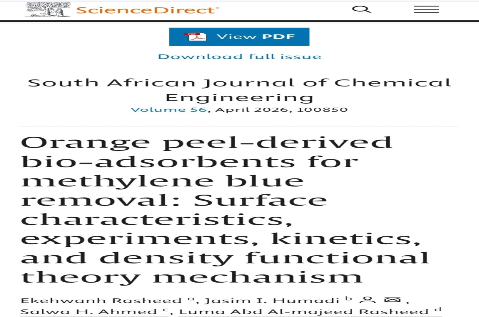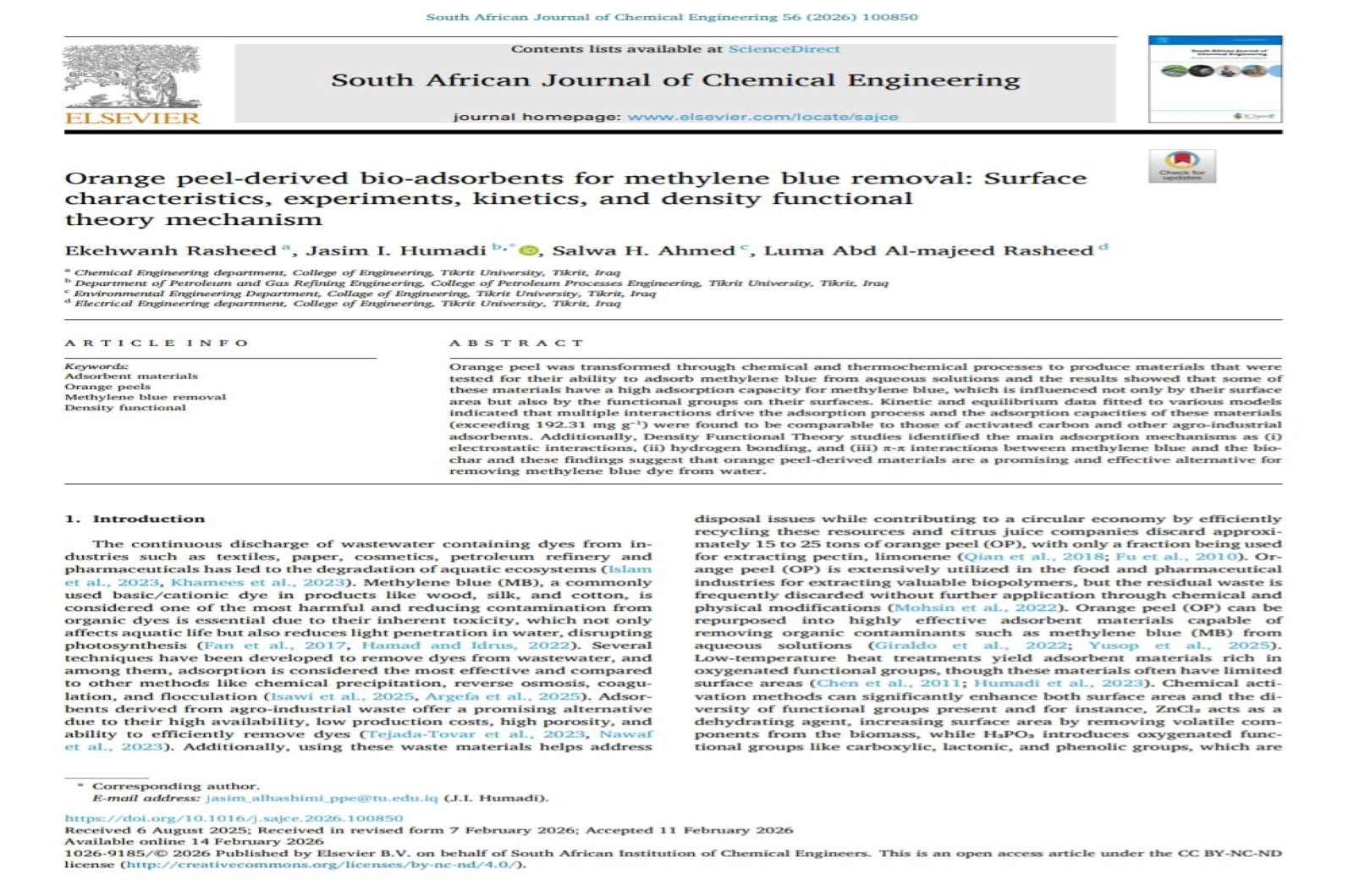 شارك التدريسي في قسم هندسة تكرير النفط و الغاز / كلية هندسة العمليات النفطية في جامعة تكريت (م. جاسم ابراهيم حمادي) و بالتعاون مع باحثين من كلية الهندسة في جامعة تكريت بنشر بحث علمي بعنوان: Orange peel-derived bio-adsorbents for methylene blue removal: Surface characteristics, experiments, kinetics, and density functional