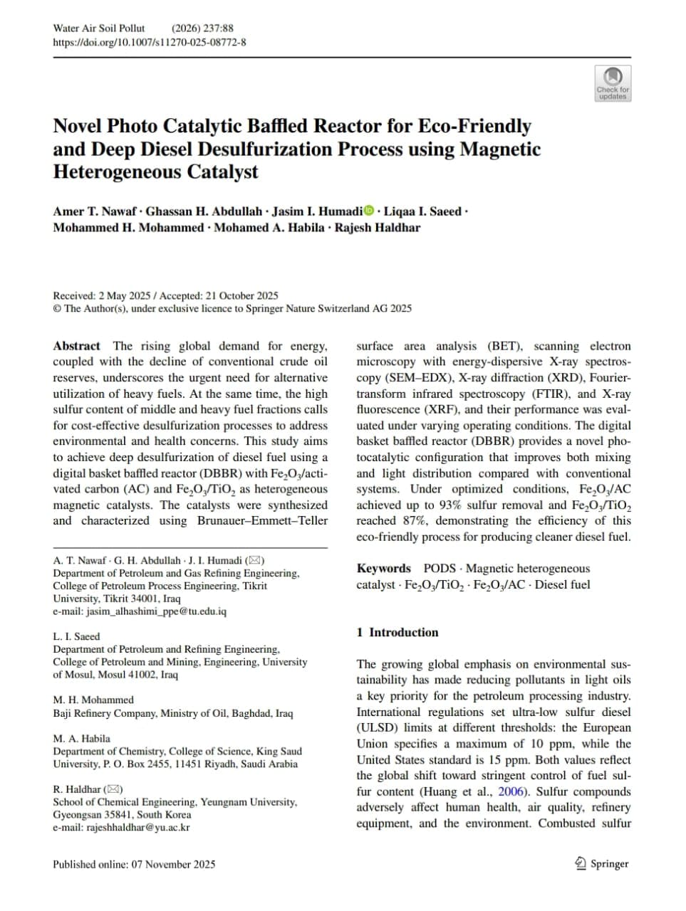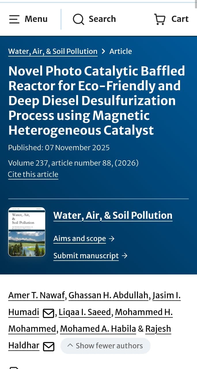 شارك السيد عميد كلية هندسة العمليات النفطية (ا.م.د. غسان حمد عبدالله) و مجموعة من تدريسي قسم هندسة تكرير النفط و الغاز (ا.م.د. عامر طلال نواف و م. جاسم ابراهيم حمادي) و بالتعاون مع باحثين من جامعة الموصل و وزارة النفط العراقية و المملكة العربية السعودية و كوريا الجنوبية بنشر بحث علمي بعنوان: Novel Photo Catalytic Baffled Reactor for Eco‑Friendly and Deep Diesel Desulfurization Process using Magnetic Heterogeneous Catalyst و الذي تم نشره في المجلة السويسرية العالمية Water, Air, and Soil Pollution و التي تصدر عن دار النشر العالمية:
