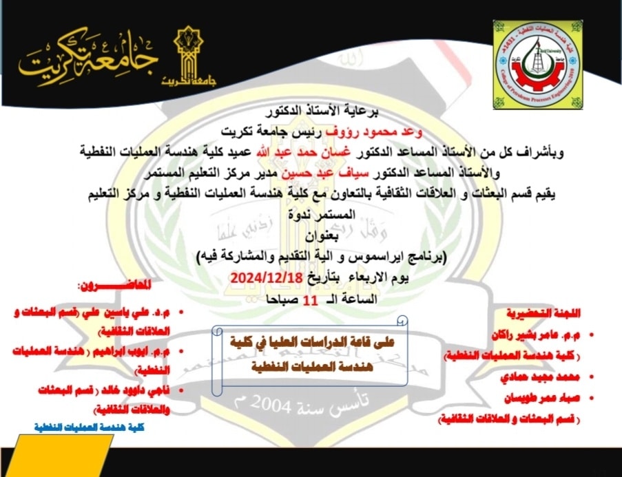 "اختيار تدريسي من كلية هندسة العمليات النفطية مقيّماً علمياً لأكثر من أربعين بحثاً في مجلات عالمية رصينة"