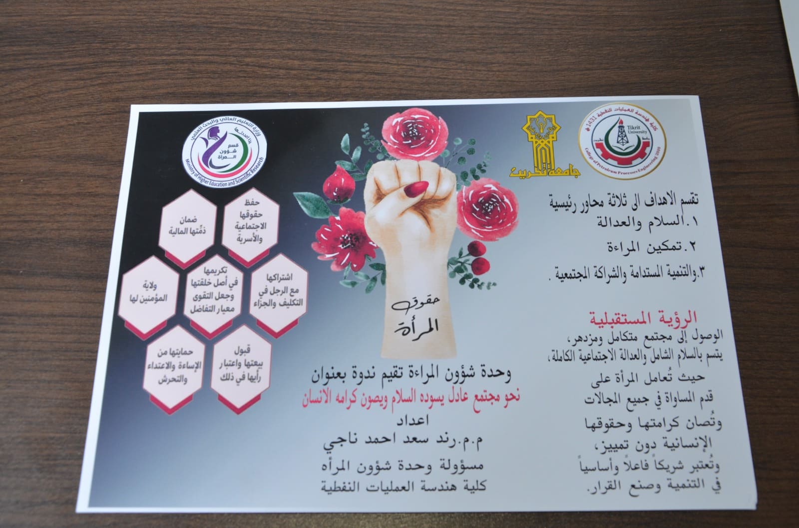 برعاية السيد رئيس جامعة تكريت الأستاذ الدكتور وعد محمود رؤوف المحترم وبإشراف كلٍّ من الأستاذ المساعد الدكتور غسان حمد عبد الله عميد كلية هندسة العمليات النفطية، والأستاذ المساعد الدكتور سياف عبد حسين مدير مركز التعليم المستمر، أقامت وحدة شؤون المرأة ووحدة الإرشاد النفسي والتوجيه التربوي في كلية هندسة العمليات النفطية ندوة علمية بعنوان: