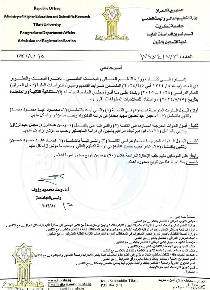صدور الامر الجامعي بالقبول النهائي في الدراسات العليا للعام الدراسي 2024-2025