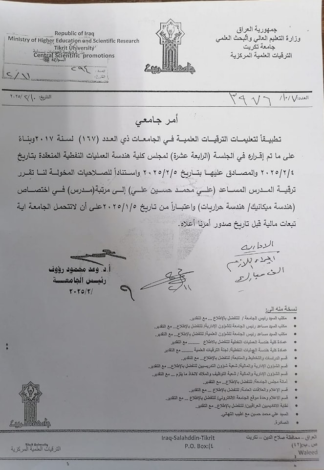 بالتهاني والتبريكات للتدريسي ( م.م.علي محمد حسين ) لحصوله على اللقب العلمي مدرس في اختصاص الهندسة الميكانيكية/ هندسة الحراريات