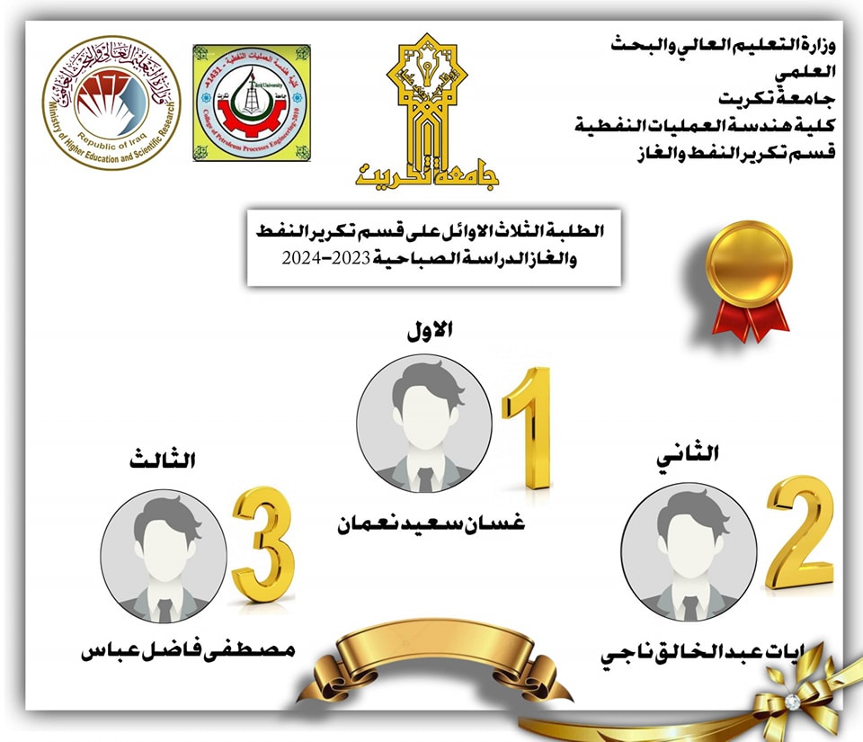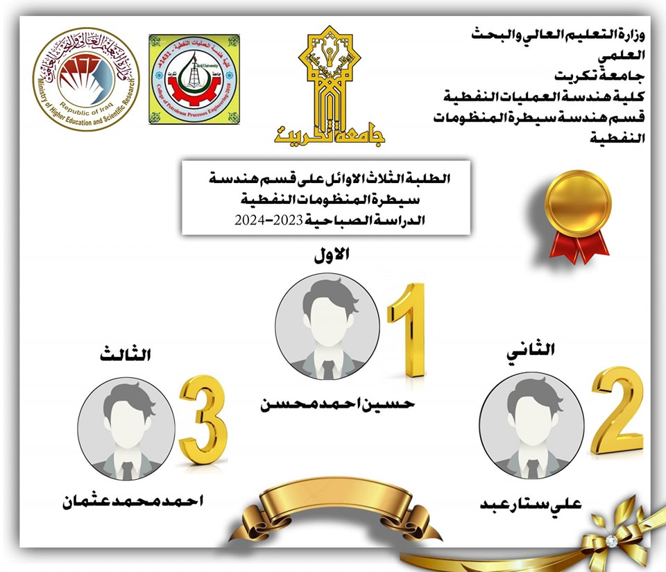تسلسلات خريجي كليتنا من الطلبة الثلاث الاوائل على القسمين قسم هندسة سيطرة المنظومات النفطية وقسم تكرير النفط والغاز وللدراستين الصباحية والمسائية.