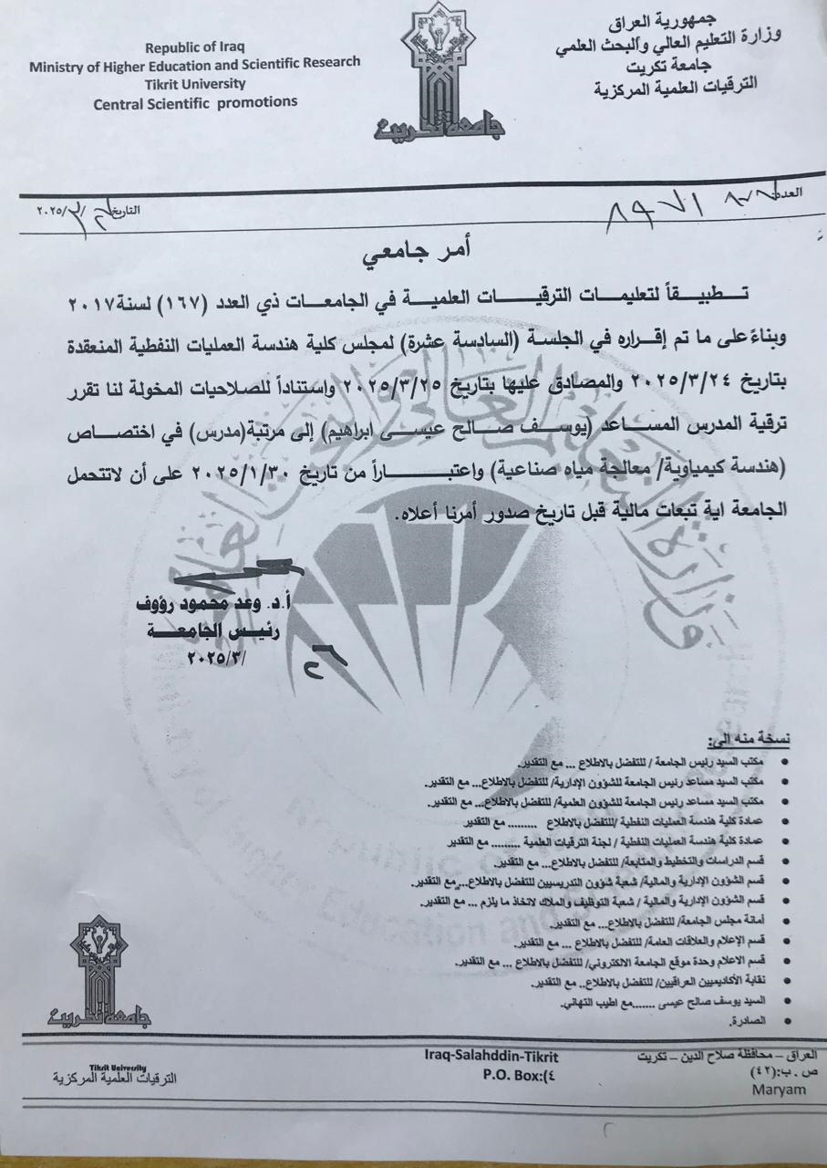 بالتهاني والتبريكات للتدريسي ( م.م.يوسف صالح عيسى ) لحصوله على اللقب العلمي مدرس في اختصاص الهندسة الكيمياوية/ معالجة مياه صناعية