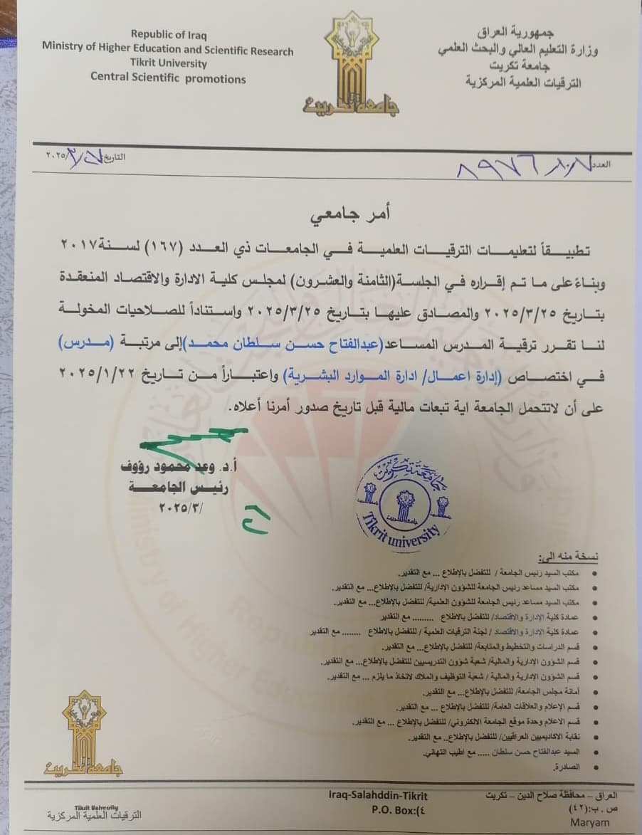 بالتهاني والتبريكات للتدريسي ( م.م. عبد الفتاح حسن سلطان ) لحصوله على اللقب العلمي مدرس في اختصاص إدارة الاعمال/ إدارة المواد البشرية