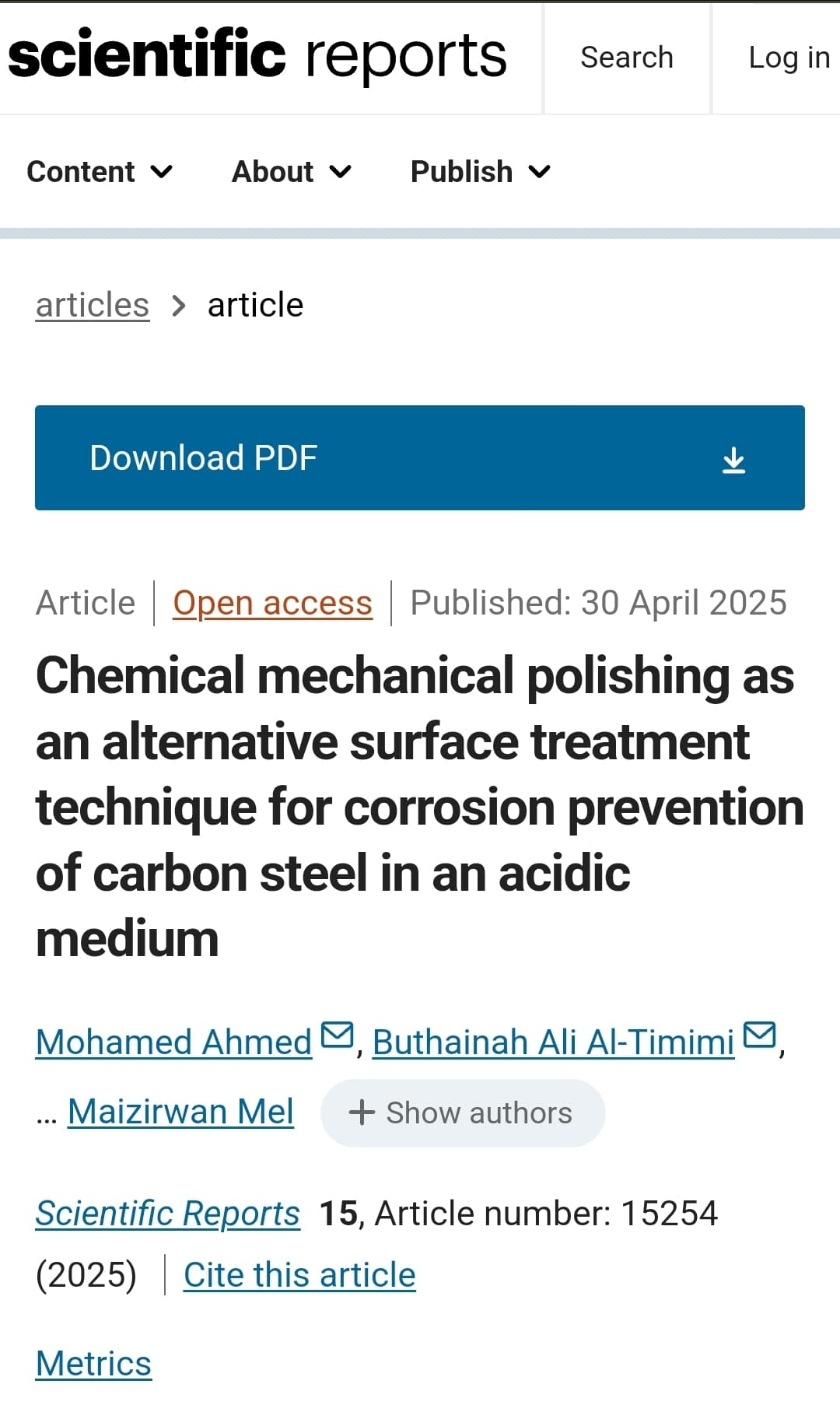 Nature Portfolio و تندرج ضمن الربع الأول Q1 وضمن مستوعبات سكوباس و كلارفيت و لها معامل تأثيرImpact factor: 3.8البحث في مجال الطلاء الميكانيكي الكيميائي كتقنية بديلة لمعالجة