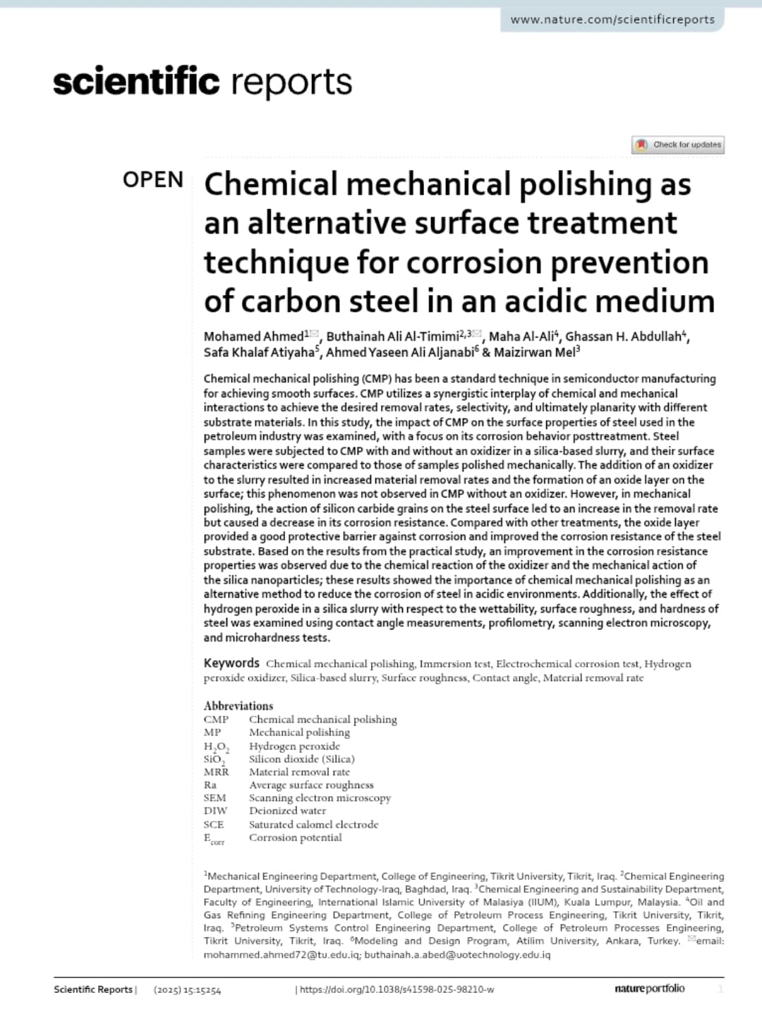 Chemical mechanical polishing as an alternative surface treatment technique for corrosion prevention of carbon steel in an acidic mediumو الذي تم نشره في المجلة العالمية