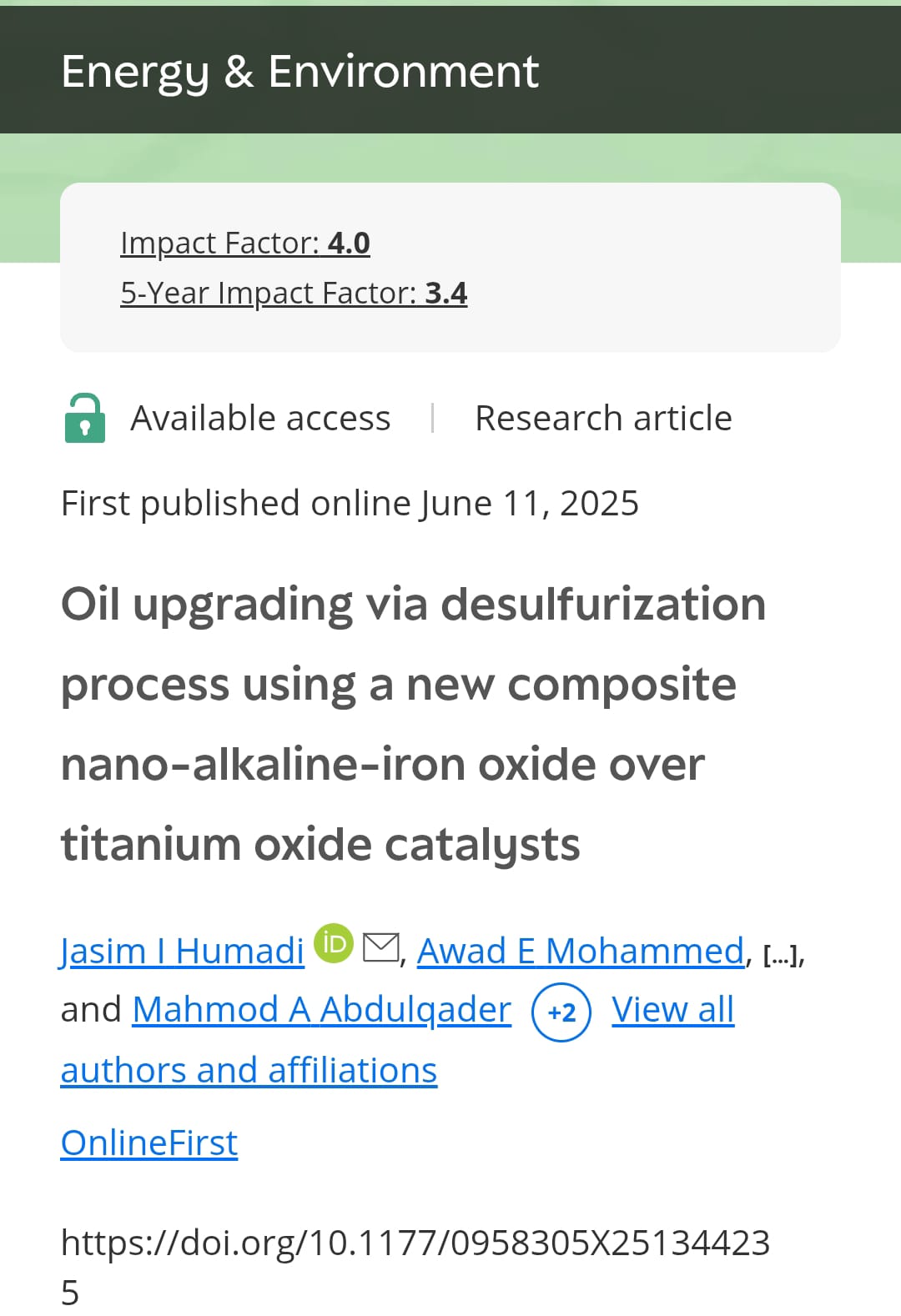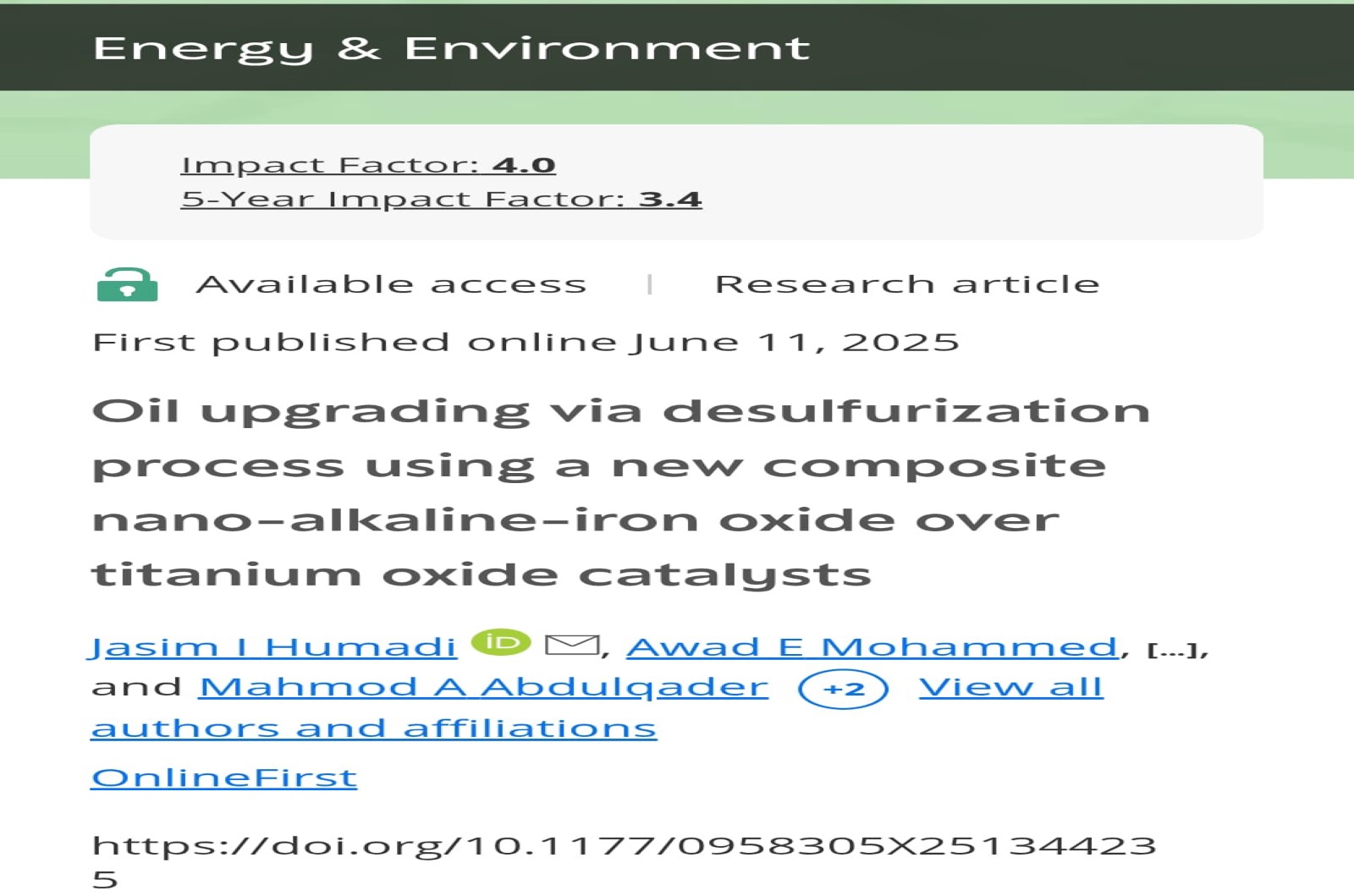 و التي تصدر عن دار النشر العالمية:Publisher: SAGE Publications Inc. و تندرج ضمن الربع الاول Q1 و تندرج ضمن مستوعبات سكوباس و كلاريفيت و لها معامل تأثير Cite score: 9.5Impact factor: 4 و قد ركزت هذه الدراسة على تطوير عامل مساعد جديد محلي الصنع لعملية تحسين مواصفات الوقود النفطي و إزالة مركبات الكبريت الضارة منه. رابط البحث:https://doi.org/10.1177/0958305X251344235