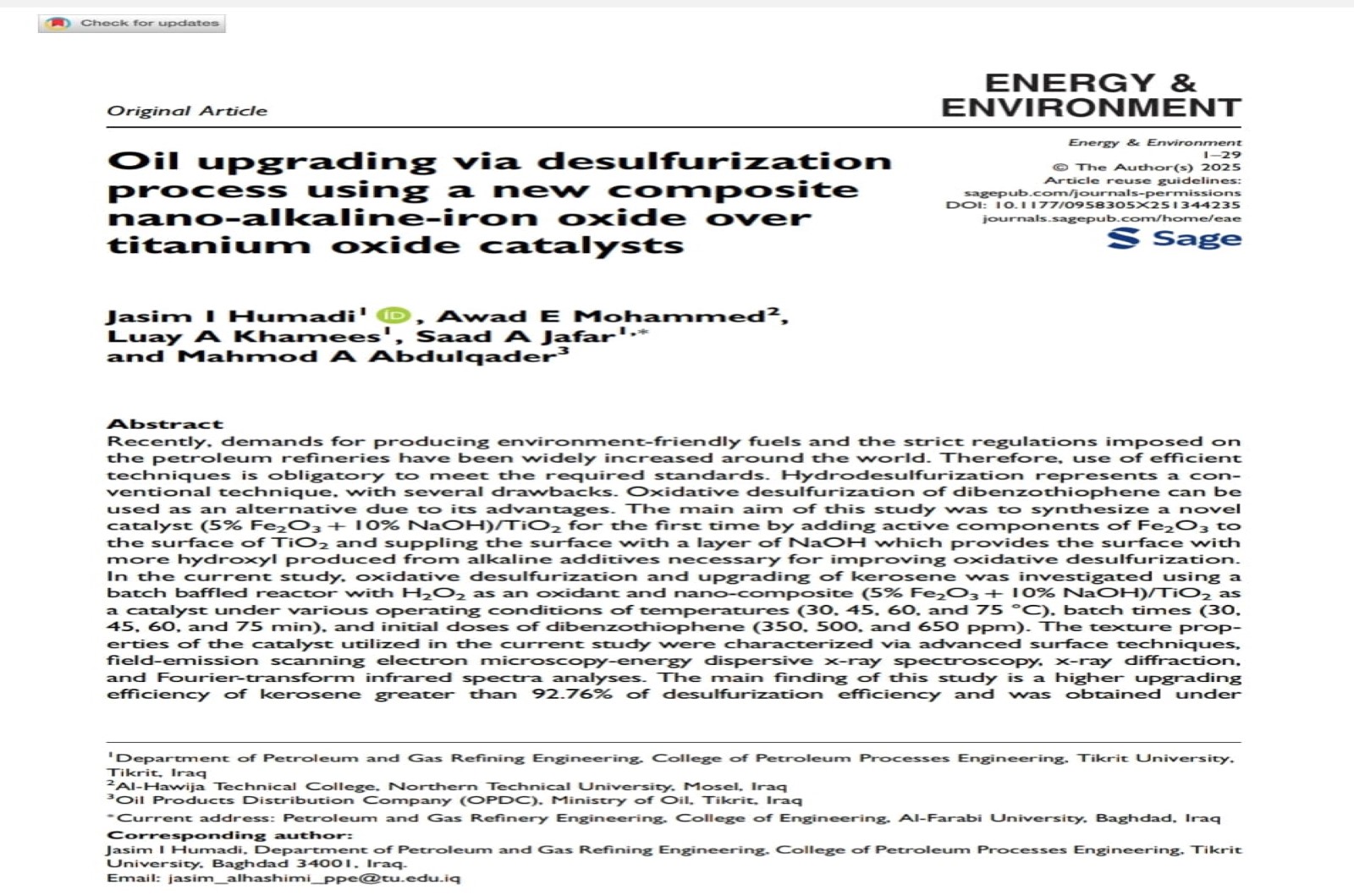 شارك مجموعة من تدريسيي قسم هندسة تكرير النفط و الغاز / كلية هندسة العمليات النفطية في جامعة تكريت (ا.د. سعد احمد جعفر، م. جاسم ابراهيم حمادي، م. لؤي احمد خميس) و بالتعاون مع باحثين من الجامعة التقنية الشمالية و وزارة النفط العراقية و كلية الهندسة في جامعة الفارابي بنشر بحث علمي بعنوان:Oil upgrading via desulfurization
