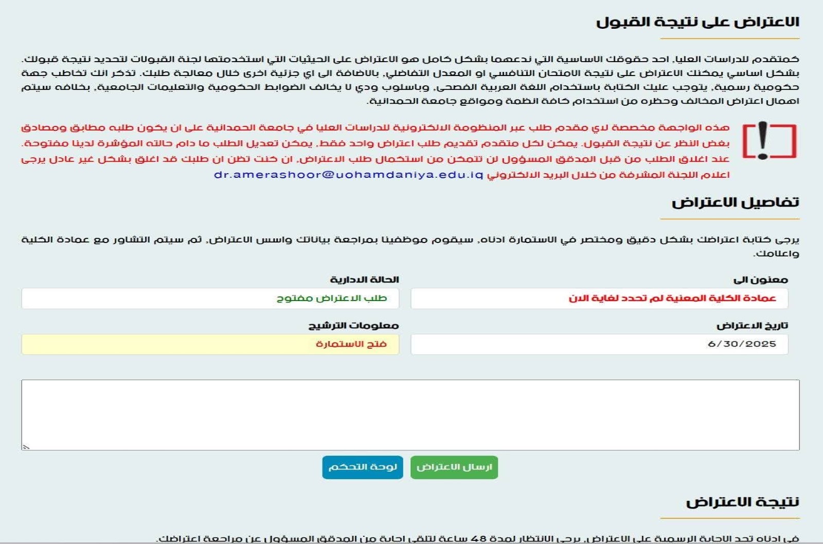 قسم شؤون الدراسات العليا يطلق استمارة الاعتراض الالكترونية للمتقدمين للدراسات العليا،