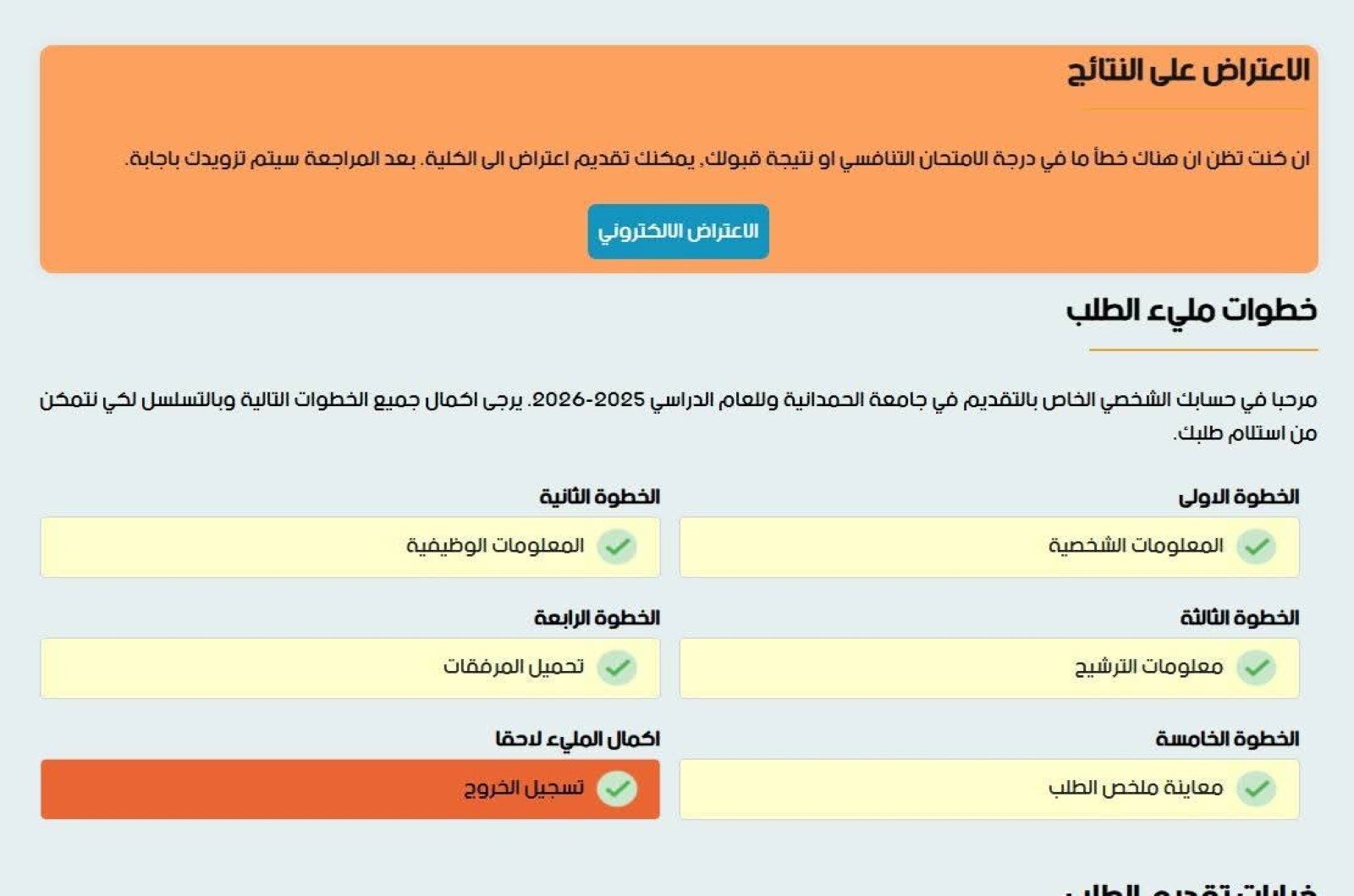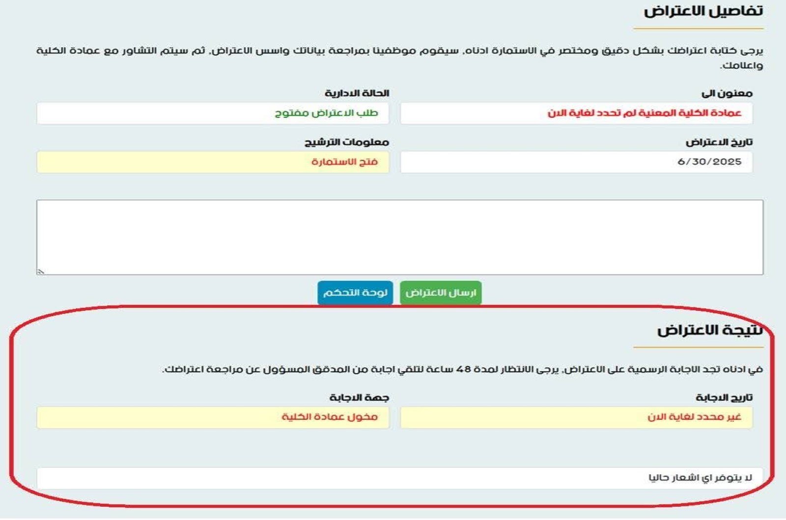 الواجهة المفعلة لتقديم اعتراضات الكترونية (نتيجة امتحان , نتيجة قبول , نتيجة تدوير)