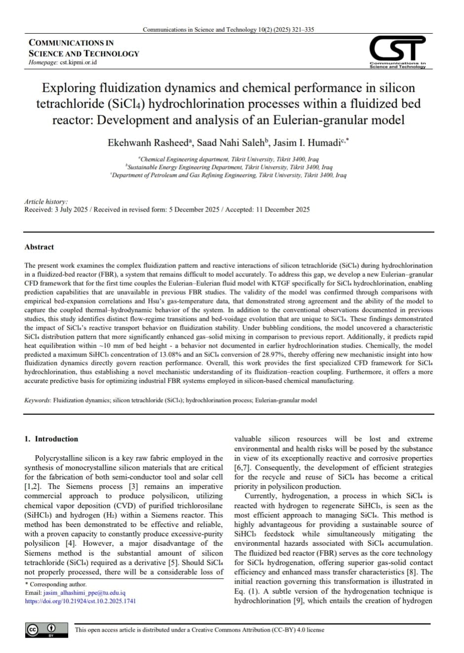 و قد ركزت هذه الدراسة على استكشاف ديناميكيات التمييع والأداء الكيميائي في عمليات هيدروكلوريد السيليكون (SiCl4) داخل مفاعل ذي طبقة مميعة